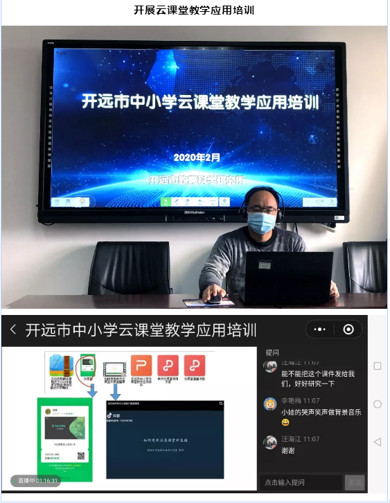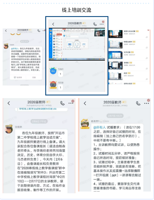 2月7日,开远市教育科学研究所电教室在线上对240余名学校平台管理员和技术人员开展云课堂教学应用培训,并要求各学校对任课教师的线上教学操作和学生线上学习进行培训;同时开通了“开远云课堂”微信交流群,以便于对全市教师进行线上教学的指导和教师之间的学习和交流。2月9日,各学校在开远市教育科学研究所电教室组织下进行开课前的网络和设备调试。2月10日,开远市各学校线上教学活动开课,各学校利用希沃云课堂、 QQ群、微信群、钉钉、国家基础教育资源网、抖音等线上授课的教育平台,组织九年级和高三学生开展线上教学活动,教师通过电脑授课,实时直播、录播课程,实现同步课堂、课外答疑辅导等方式开展线上教学,学生通过手机、pad、电脑等在家进行同步学习。教师在线布置作业、在线批改作业,巩固强化学习效果。据初步统计,2月10日全市有716名教师参与在线教学和辅导,有5964名学生参与在线学习。