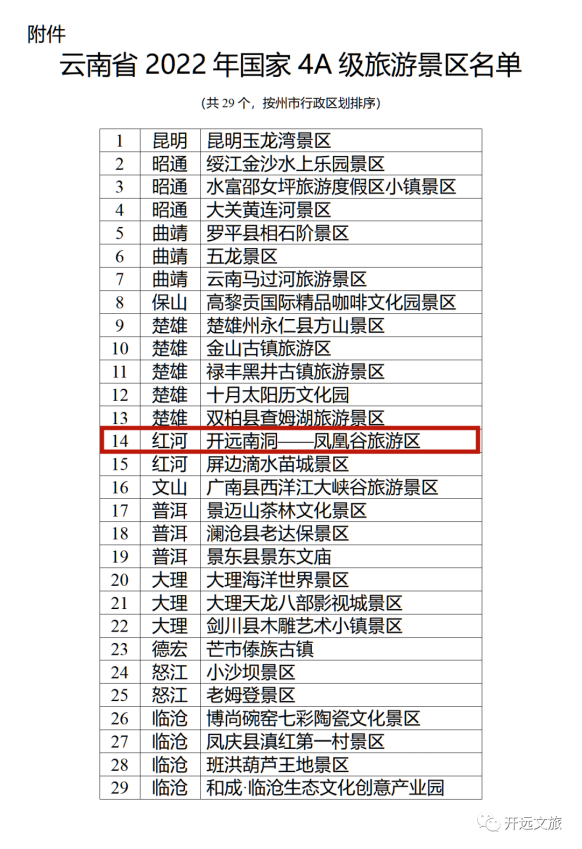依照中华人民共和国国家标准《旅游景区质量等级的划分与评定》和《旅游景区质量等级管理办法》标准,经开远市文化和旅游局推荐,省文化和旅游厅按程序组织综合评定,于2022年10月26日确定南洞—凤凰谷旅游区达到了国家4A级旅游景区质量等级标准,成功创建为国家4A级旅游景区。目前,我市共有国家4A级旅游景区2家。