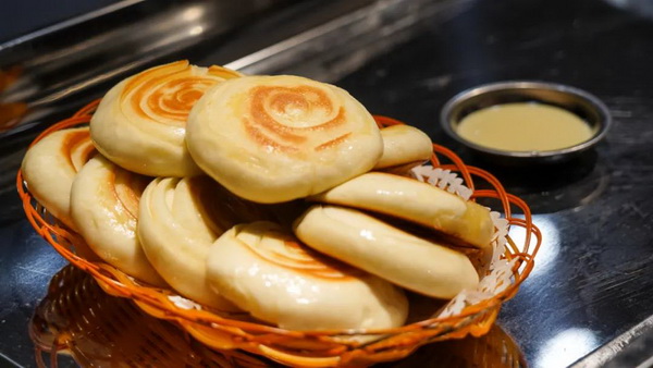 面粉中加入黄油、炼乳,巧手和面,待饧发合适,擀成均匀的方形面皮,刷上黄油起酥,辗转曲卷成卷,挥刀切成小段,揪剂子,按压成圆饼,上锅蒸12分钟后取出,用油煎至金黄。盛到盘中,一圈一圈盘旋而成,色黄而油润,搭配炼乳一起吃,外酥脆而内喧软,黄油香气沁人心脾,既有传统中式盐酥饼之香,又有西式糕点之浓郁。