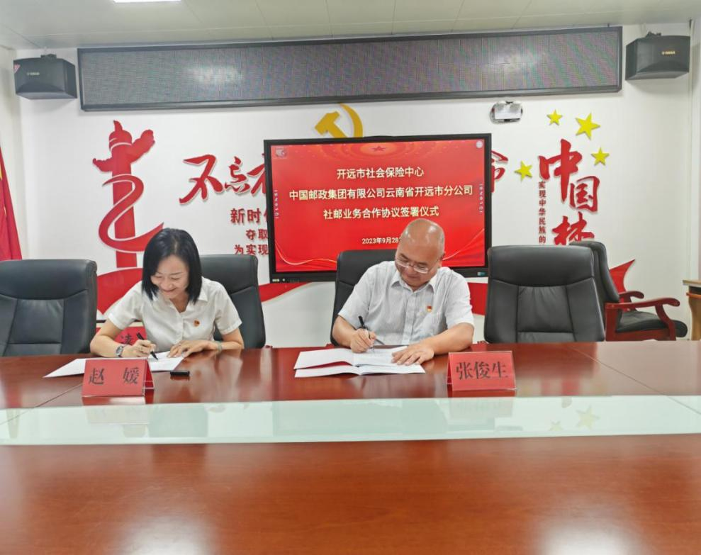 为满足参保人员对高质量社保服务的需求,打通服务的“最后一公里”,开远市大力推行“社邮合作”人社服务新模式,积极拓展人社服务空间、延伸服务链条、提升服务质量,努力让群众办事更近、更快、更便利,进一步满足群众“少跑腿”“便捷办”的社保服务需求。2023年9月28日,开远市社会保险中心与中国邮政集团有限公司云南省开远市分公司举行“社邮”业务合作签署仪式,市人社局党组书记、局长王俊和邮政开远市分公司总经理张俊生以及相关工作人员参加签署仪式。