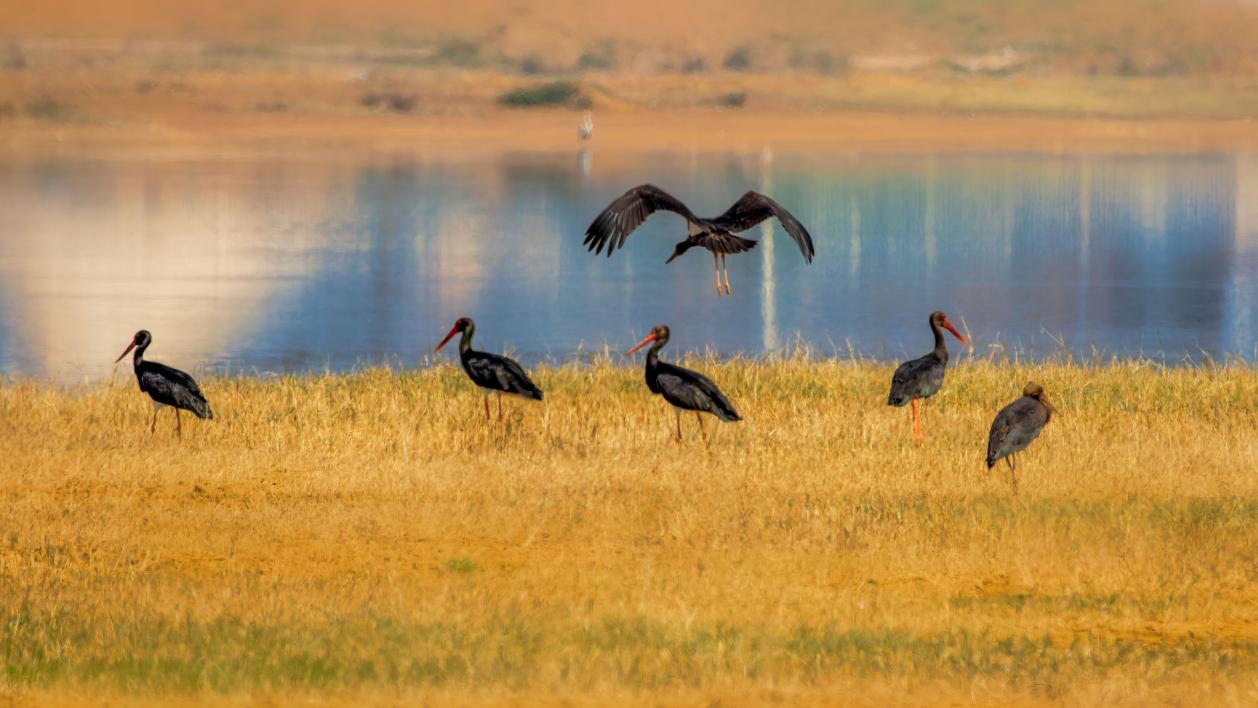 随着生态环境的持续改善,在开远境内观测记录到的珍稀鸟类不断增多。2019年,摄影爱好者首次在三角海发现迁徙而来的黑鹳,当时仅有1只。黑鹳被称为“鸟中大熊猫”,属国家一级重点保护野生动物,极其少见。而在2022年1月,三角海湿地发现的黑鹳数目已增长到7只,并成群出现。