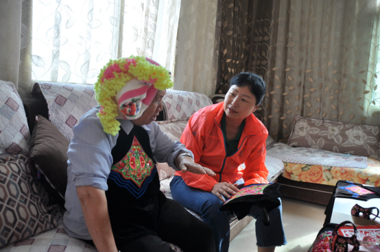 与剪纸绣县级传承人张自英老人进行交流