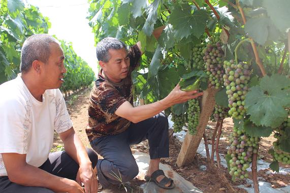 合作社负责人察看葡萄生长情况