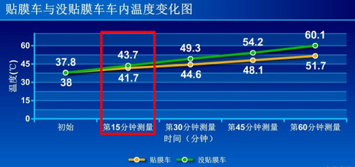 根据媒体做的实验结果显示:当时北京的最高气温为30℃,天气晴朗,微风。中午12:00左右的地面温度43.4℃左右。选取两辆车进行试验,一辆为贴膜的车,另一辆为没贴膜的车。通过测试,在午后太阳直晒的情况下,无论是贴膜还是没有贴膜的车,车内温度都在快速上升,其中在第60分钟测试时,两个车内的温度几乎都达到了最高温度,贴膜车车内最高温度达51.7℃,没贴膜车车内温度达60.1℃。