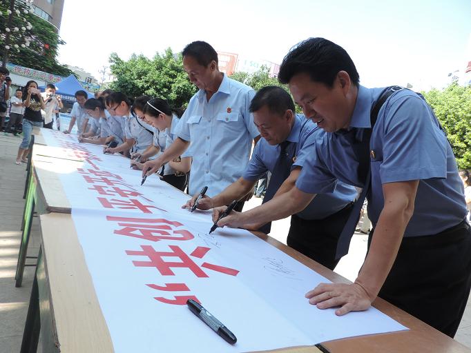 佘建军、李建科、胡惠卓三位市级领导首先在横幅上签字。随后,来自各乡镇(街道)、市级各部门和在开企事业单位的分管领导,全市政法干警代表以及过往市民在写有“共创平安开远-我承诺我参与”万人签名活动的横幅上纷纷签上了自己的名字。同时,各相关部门的工作人员在现场设立了集中宣传点,向过往群众发放宣传资料,讲解安全防范知识,组织观看宣传展板,进一步增强群众的法制观念和安全意识,为我市平安建设再添活力。
