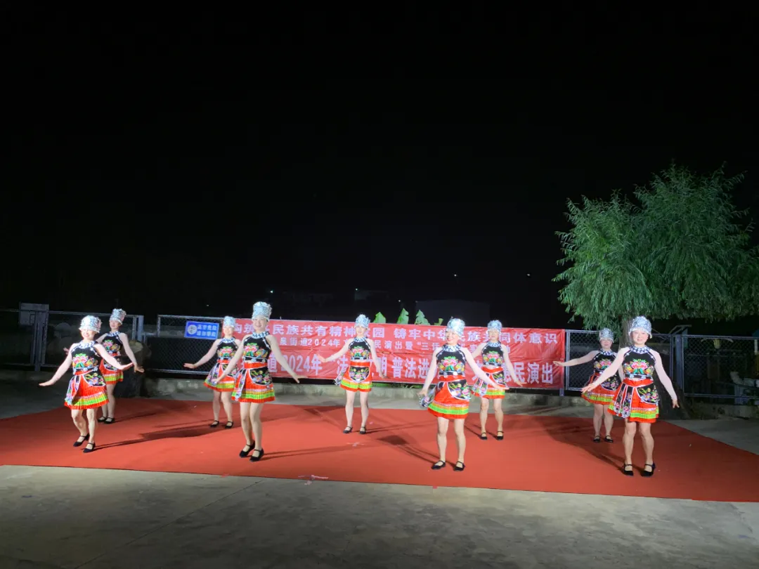 街道以“构筑各民族共有精神家园,铸牢中华民族共同体意识”为主题,采用小品、快板、花灯、舞蹈等群众喜闻乐见的形式,在山区村委会开展文艺巡回演出,为山区群众送上充满正能量的精神文化大餐,进一步提升群众幸福感和满意度。舞蹈《我的祖国》、《再唱洗衣歌》、《江山》等讴歌了对党、对国家、对家乡的无限热爱和美好心愿,引导群众将“感党恩、听党话、跟党走”融入到铸牢中华民族共同体意识中。目前已在马头坡、份玉、老邓耳开展了文艺巡回演出,受益观众达2000余人。