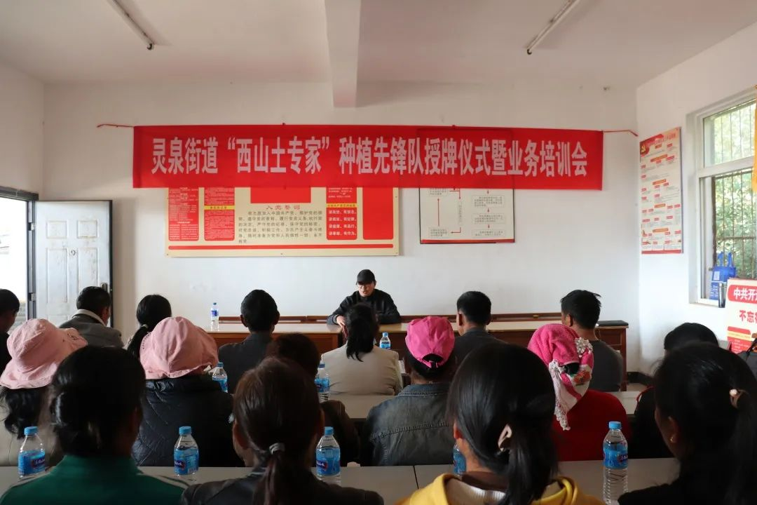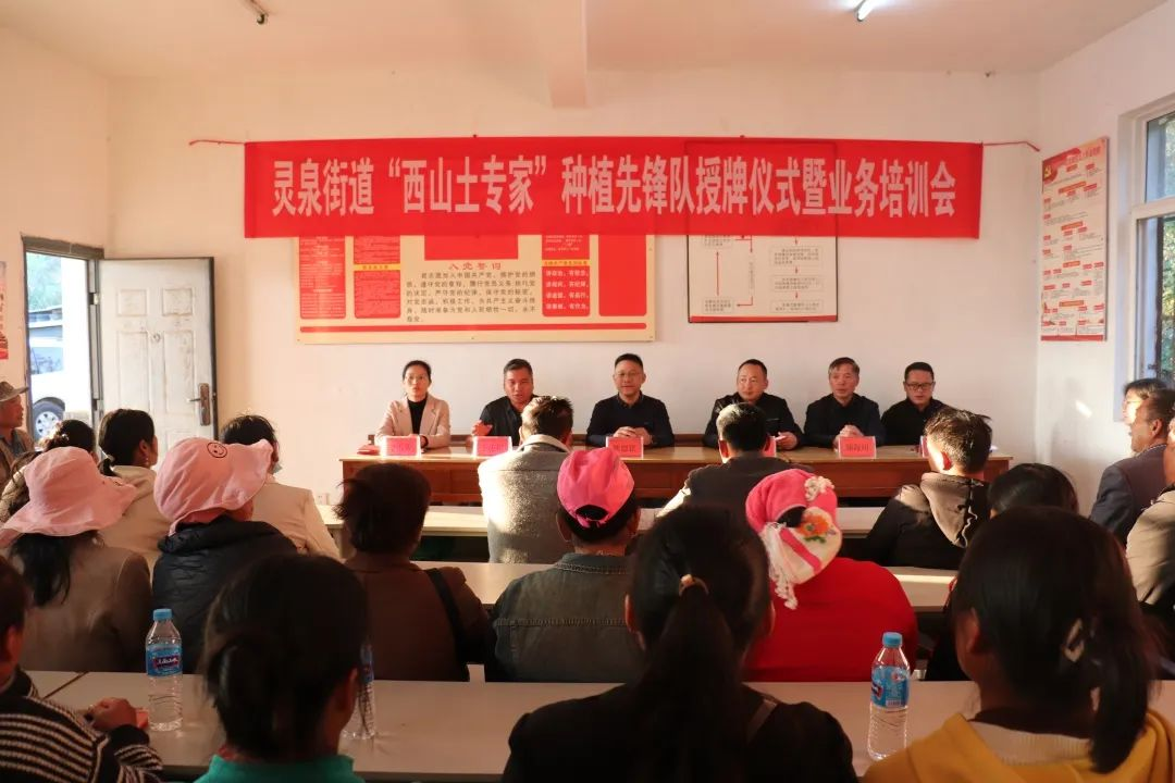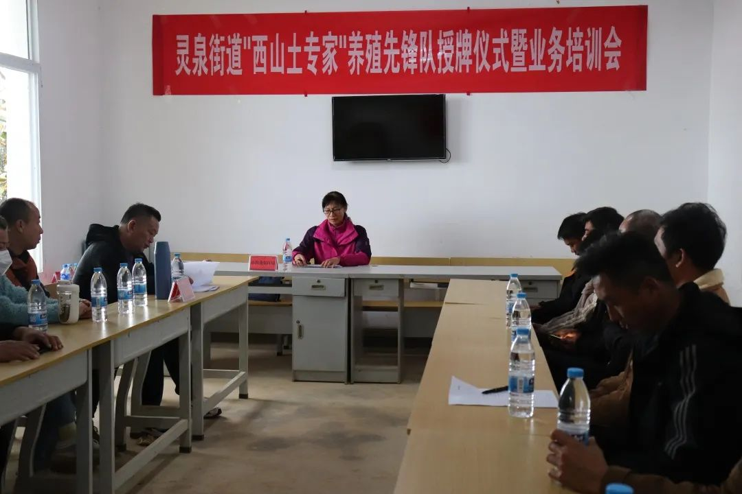12月8日,灵泉街道在那丕村召开“西山土专家”养殖先锋队授牌仪式暨业务培训会,街道党政主要领导及部分班子成员、开远市国洪经贸有限公司相关负责人及40名养殖“土专家”参加会议。