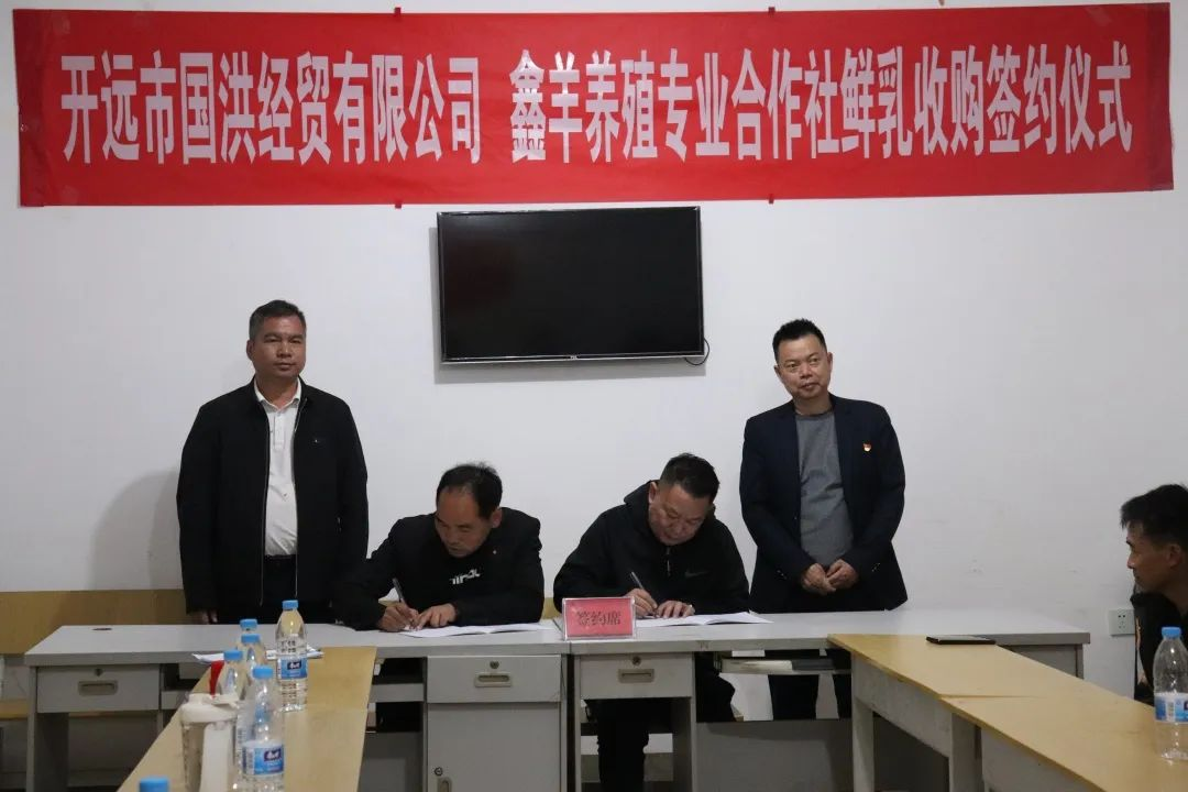 最后,街道党工委副书记、办事处主任王应和与开远市国洪经贸有限公司法定代表人袁国洪签订乳制品精深加工协议。开远市国洪经贸有限公司法定代表人袁国洪与鑫羊养殖专业合作社社长王勇签订鲜乳收购协议。