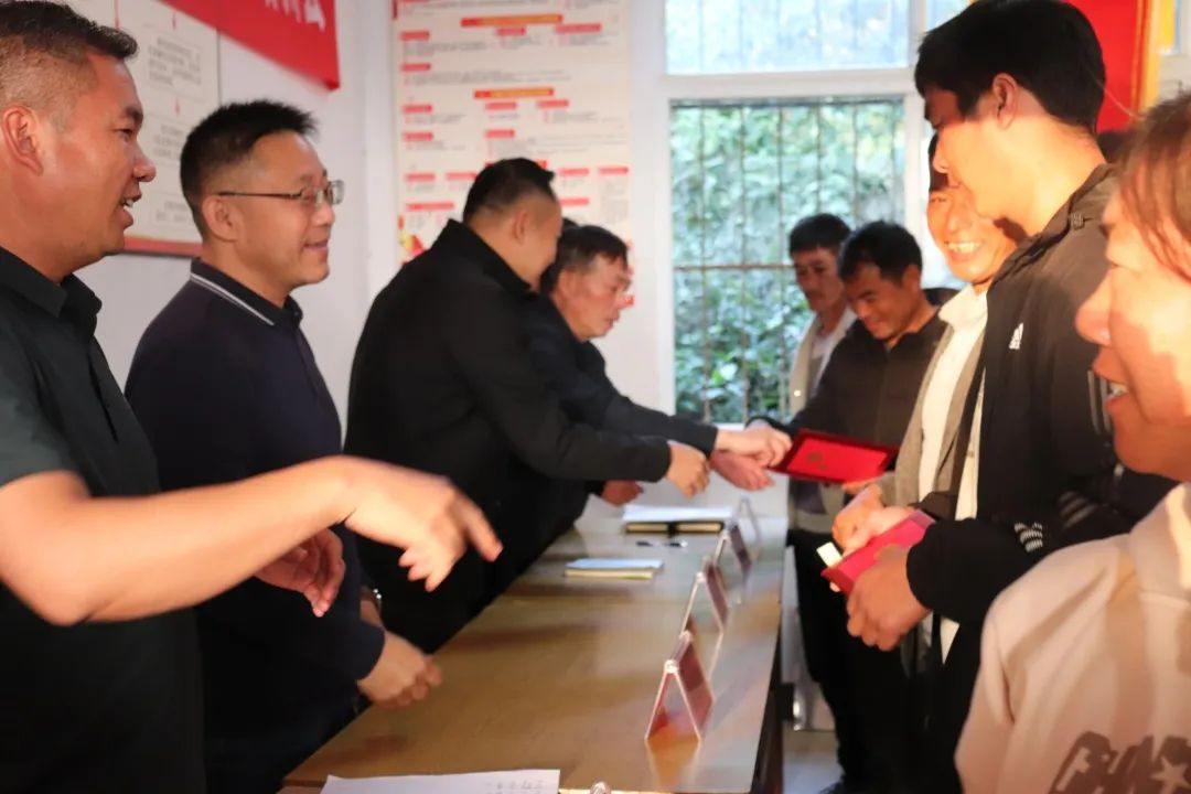 街道党工委书记邰剑平向“西山土专家”养殖先锋服务队队长王勇授牌