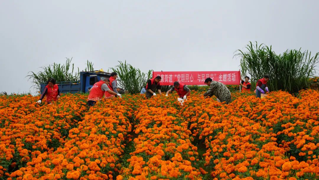 花丛中,花农的身影来往穿梭,采摘着朵朵菊花。灵泉街道的干部职工们也不甘落后,戴起手套,拿起袋子,在花农的指导下,动作从生疏到娴熟,采摘的速度也越来越快。大家分工明确、团结协作,鼓足干劲,就算是裤子、鞋子被花丛上的雨水浸湿也毫不在意。