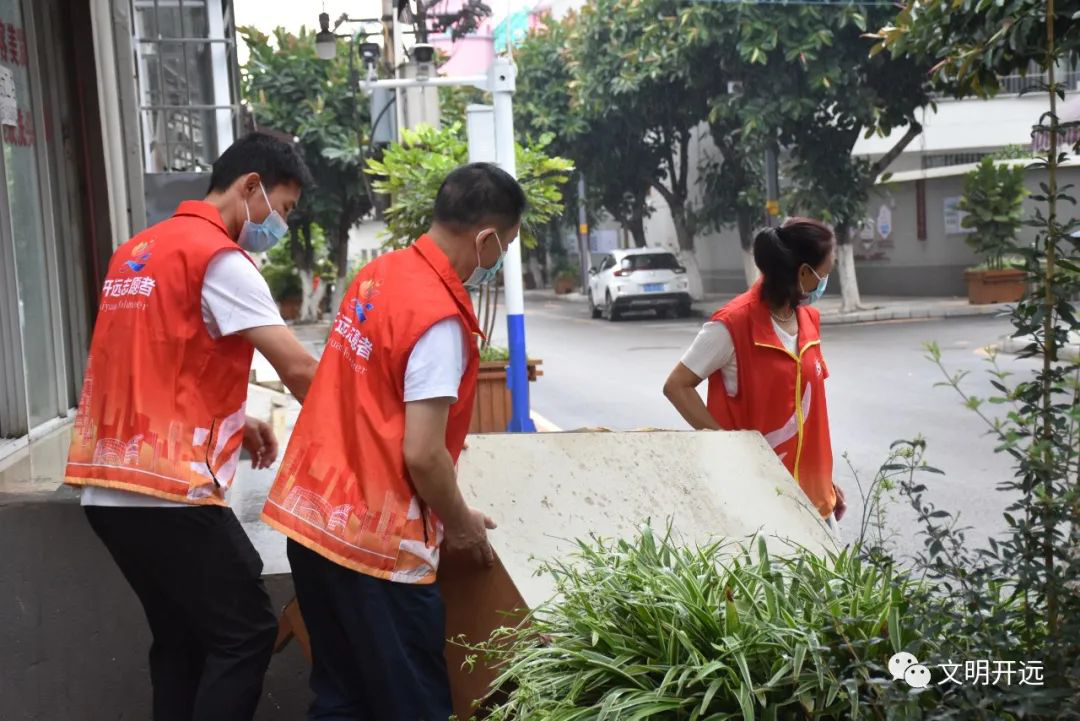 在健民社区,身穿“红马甲”的志愿者们穿梭在大街小巷,引导居民群众不乱堆杂物、不乱停车辆,爱惜绿化,不乱晒乱挂;引导商铺经营者保持店铺门前整洁卫生,不占道经营,并对占道堆放的物品进行清理。