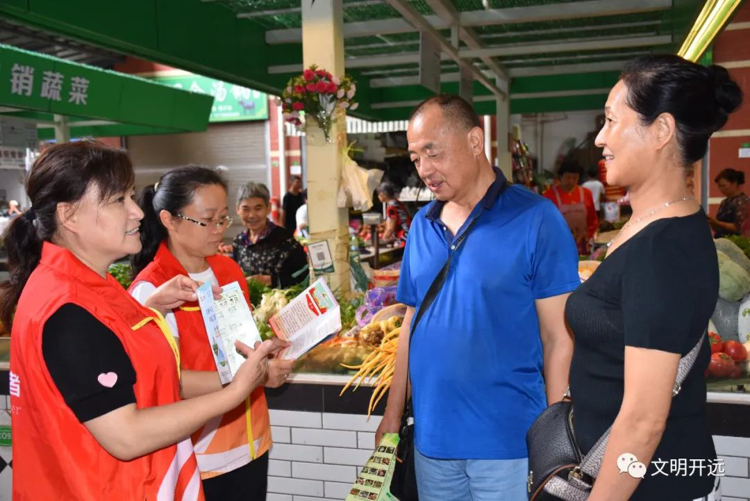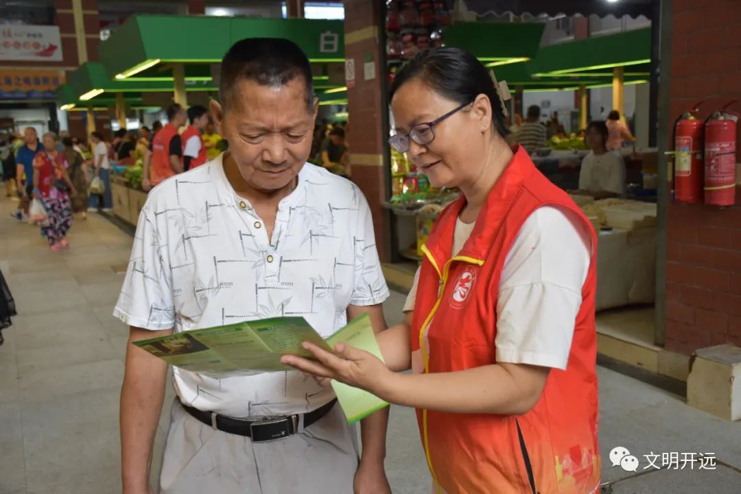 志愿者们走进东城集贸市场,向周边商铺和过往市民发放宣传资料,宣传文明城市的有关知识,倡导大家积极参与到创建文明城市的工作中来,自觉规范个人言行、维护市容市貌环境、爱护公共设施、诚实守信经营,争做文明风尚的传播者、文明创建的实践者。