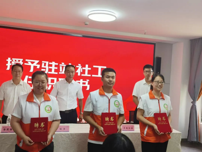 州民政局、市民政局、灵泉街道办事处及灵泉社工站四方代表共同签署社工站四方共建协议。