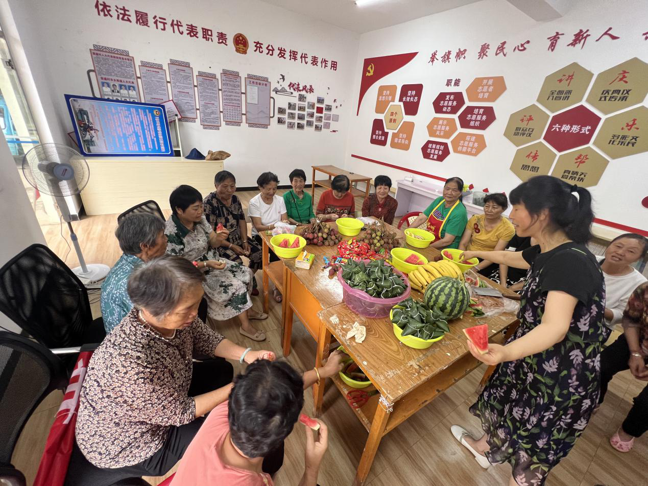 送粽上门过佳节。在卧龙谷村委会,村“两委”班子和驻村工作队一起开展端午主题活动,党员志愿服务队送粽上门,把包好的粽子送到辖区独居老人、孤寡老人、特困群众等群体家中,为他们送去节日的祝福。