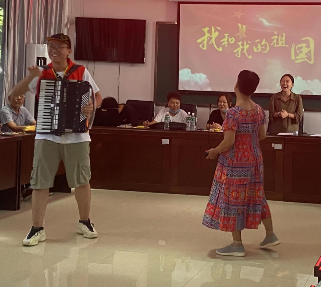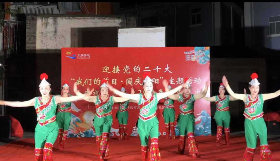健民社区组织文艺队为社区居民带来舞蹈、戏曲和合唱等多种形式的精彩节目,深情表达对祖国和家乡的热爱。