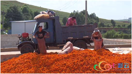 在万寿菊鲜花收购站,村民将采摘后的万寿菊拉到这里,统一过磅后,直接投放到储花池,极大地减少鲜花因收购时间较长而烂在地里的损失。收购价格也较往年有所提高,并且当天就能收到花款。
