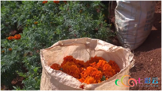 万寿菊花田里,德果村村民金忠强夫妻俩在地里忙活着,这是他家采收的第二拨万寿菊。