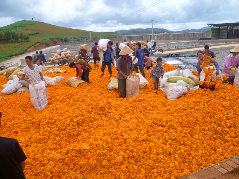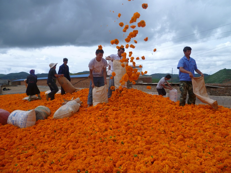 万寿菊产业具有订单农业的优势,即种前有合同、产后公司包收、不分等级等特征,而且种植投资少、见效快、效益高,从2011年就在灵泉落户,公司还在当地建厂收购、加工。西山区域大部分村民都种植了万寿菊,很多苗彝族农户因此摘掉了贫困的帽子,从而走向脱贫致富之路,实现了订单农业带来的收益。
