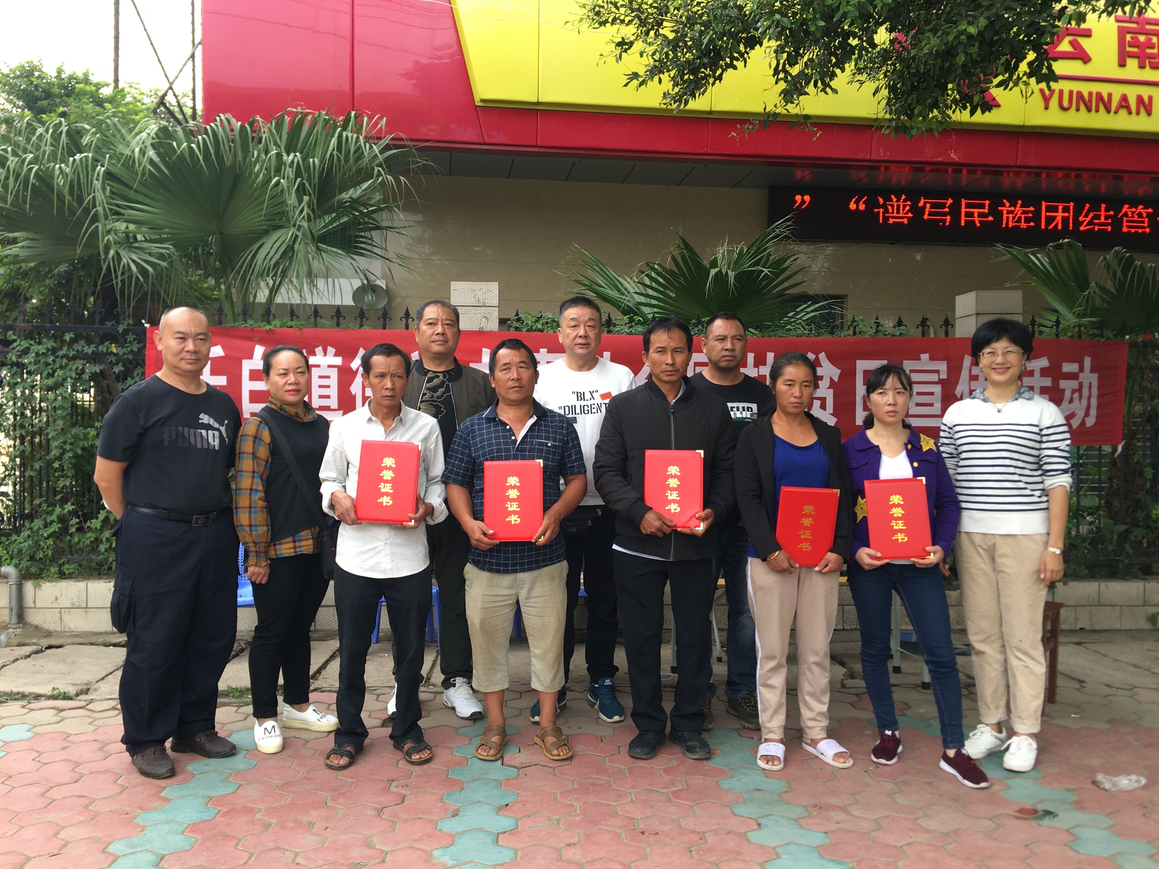 在新寨村委会的活动点上,相关人员向过往群众发放了健康扶贫政策、教育扶贫资助政策、助残政策等宣传资料,同时提供免费测量血压的服务;之后为该街道前期评选出来的15户脱贫光荣户中的5户脱贫光荣户代表举行了简短的表彰仪式,为他们颁发奖状和奖品,鼓励他们继续巩固脱贫成效、发挥表率作用。而该街道其余涉贫的村委会(农村社区)也结合实际开展了相关的宣传和对其余10户脱贫光荣户进行表彰。
