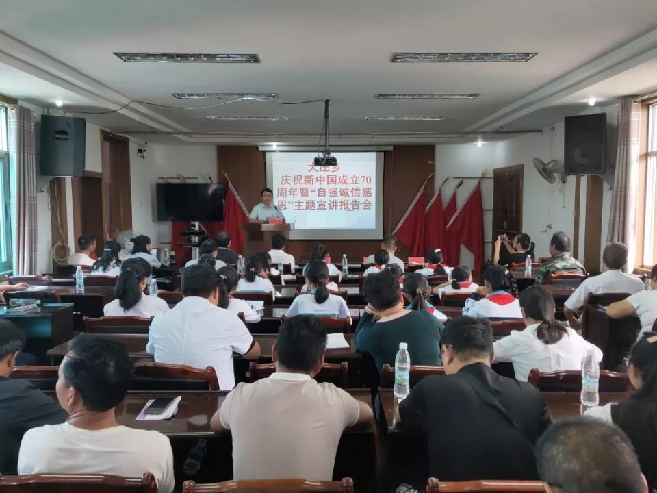 为不断激发群众的内生动力,引导全乡各族群众感党恩、听党话、跟党走,不断弘扬大庄正能量,将无形的正能量转化为激发群众不断进取、不断奋斗的行动力,近日,在新中国成立70周年之际,大庄乡以“与祖国对话——现身说法”为主题,在全乡范围内开展“自强、诚信、感恩”主题宣讲报告会。全体机关干部职工、各村“三委”班子成员、各宣讲代表、学生代表等100余人参加。