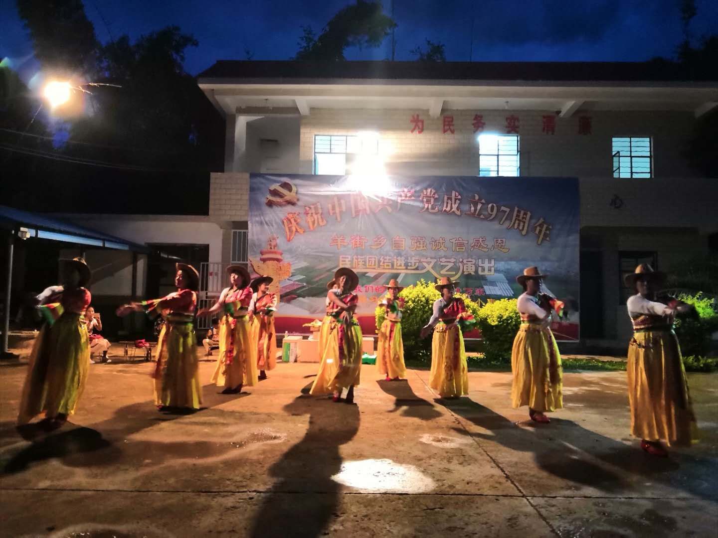 为庆祝中国共产党成立97周年,进一步深入联系群众,保持同人民群众的血肉联系,增强广大党员的光荣感、使命感,促进民族团结进步,7月11日,羊街乡开展“庆祝建党97周年自强诚信感党恩民族团结进步文艺演出进乡村”活动。