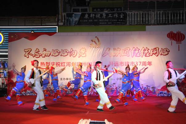 “今天我们欢聚一堂,为迎接红河州建州61周年、开远市建市37年,以及第36个民族团结宣传月的到来,向我们伟大的党献上我们最诚挚的祝福”,随着主持人的清脆的一声开场白,来自各社区的文艺队纷纷献上了《茶山欢歌》、《母亲是中华》、《有个地方叫红河》等15个精神节目,活动中,还穿插了反腐倡廉、扫黑除恶专项斗争等知识问答。