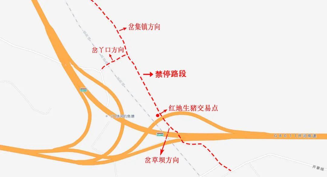 开蒙线仁丫段,即:红地生猪交易点及岔草坝方向、岔古城村委会丫口村和岔集镇方向全路段,具体禁停路段如下图所示。