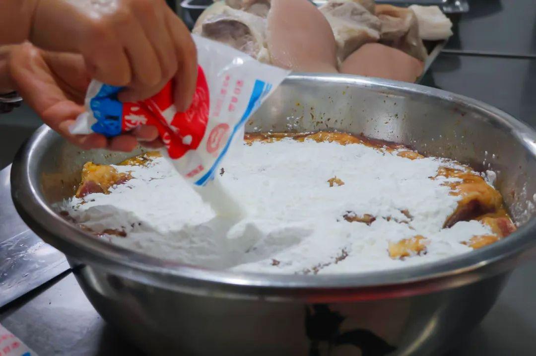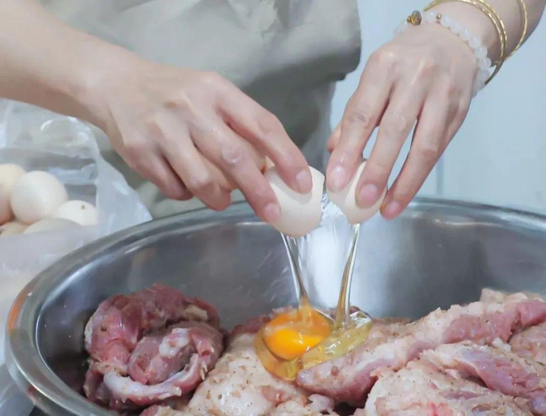 最后把肉块放入大盆中,开始加入其他调料。先打入几个新鲜鸡蛋,边打入鸡蛋边用双手轻轻搅拌,让蛋液均匀地裹在肉块上,同时撒上少许糖提色增鲜。接着倒入适量的食用淀粉,用量需要根据肉块的多少和鸡蛋的湿度来灵活调整,一般以肉块表面能均匀裹上一层薄薄的粉浆,且不会出现干粉为宜。