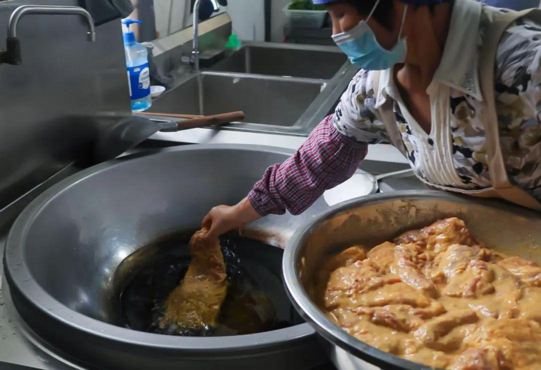 腌制好的肉块需要静置1小时左右,让调料进一步渗透。与此同时,开始准备油炸。在黑泥地社区,绝大多数居民家中都有一口特制的大铁锅,这口锅不仅容量大,而且受热均匀,是制作大酥的绝佳工具。将适量的菜籽油倒入锅中,菜籽油独特的香味能与猪肉的味道完美融合。开大火将油烧至七成热,判断油温是否合适有个小窍门:可以用筷子插入油中,如果周围立刻冒出细密的小气泡,就说明油温达到了要求。