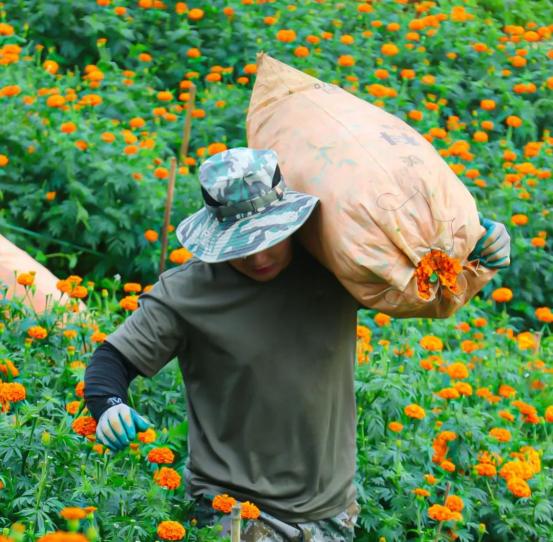 来到花田里,大家分散在田间,有条不紊地开始采摘万寿菊。有的志愿者负责采摘花朵,动作娴熟地将一朵朵盛开的万寿菊摘下,放入随身携带的袋子里;有的则负责搬运装满花朵的麻袋,往返于田间和运输车辆之间。
