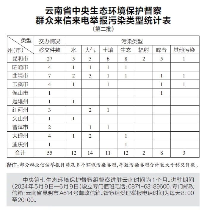 5月11日,中央第七生态环境保护督察组向云南移交第二批群众信访举报件55件,其中来电举报53件,来信举报2件。从信访举报件生态环境问题污染类型来看,涉及水12件、大气14件、土壤11件、生态12件、辐射2件、噪音8件,其他污染3件。从区域分布上看,昆明市27件、昭通市4件、曲靖市7件、玉溪市4件、保山市1件、楚雄州1件、红河州3件、文山州1件、普洱市2件、大理州4件、迪庆州1件。截至当日,云南省已累计收到中央第七生态环境保护督察组交办的信访举报件90件,所有举报件均已及时转交相关州(市)处理。