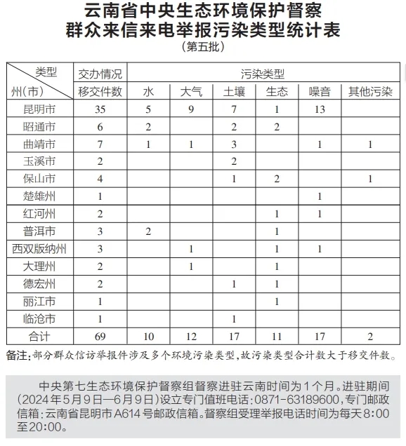 5月14日,中央第七生态环境保护督察组向云南移交第五批群众信访举报件69件,其中来电举报53件,来信举报16件。从信访举报件生态环境问题污染类型来看,涉及水10件、大气12件、土壤17件、生态11件、噪音17件,其他污染2件。从区域分布上看,昆明市35件、昭通市6件、曲靖市7件、玉溪市2件、保山市4件、楚雄州1件、红河州2件、普洱市3件、西双版纳州3件、大理州2件、德宏州2件、丽江市1件、临沧市1件。截至当日,云南省已累计收到中央第七生态环境保护督察组交办的信访举报件317件,所有举报件均已及时转交相关州(市)处理。