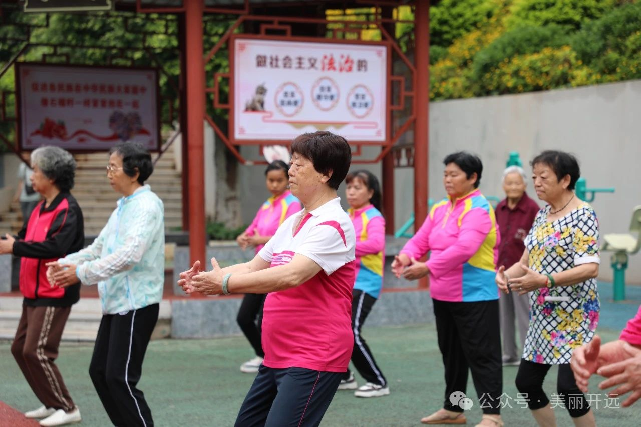 早上8点,沐浴着晨光,红运社区居民赵天凤在社区小广场上练习八段锦。小广场是社区居民的文体活动中心,位于社区中心地段,设有锻炼场地和健身设施,每天都会有很多居民在此锻炼。