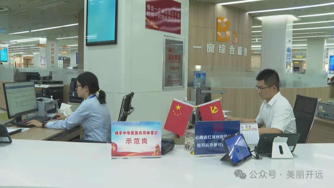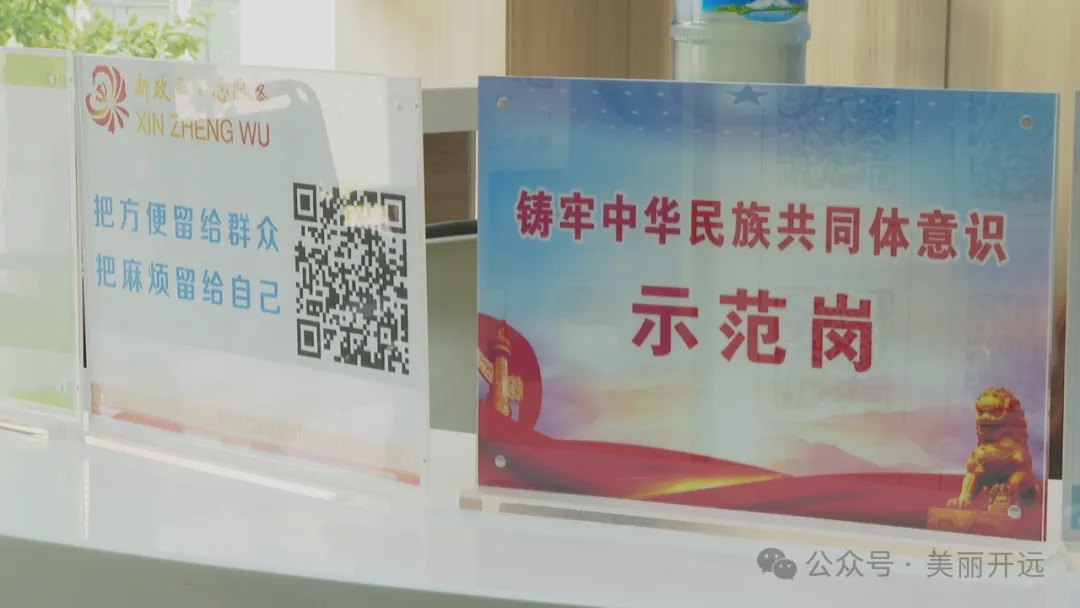 行走在“客厅式”的服务中心,处处张贴着中华民族一家亲的标语,各服务区还设有“铸牢中华民族共同体意识示范岗”“服务之星”等标牌。针对各族群众需求,该中心设有引导台和“爱心号”,周边还有党建文化墙、红色图书专柜等功能区。
