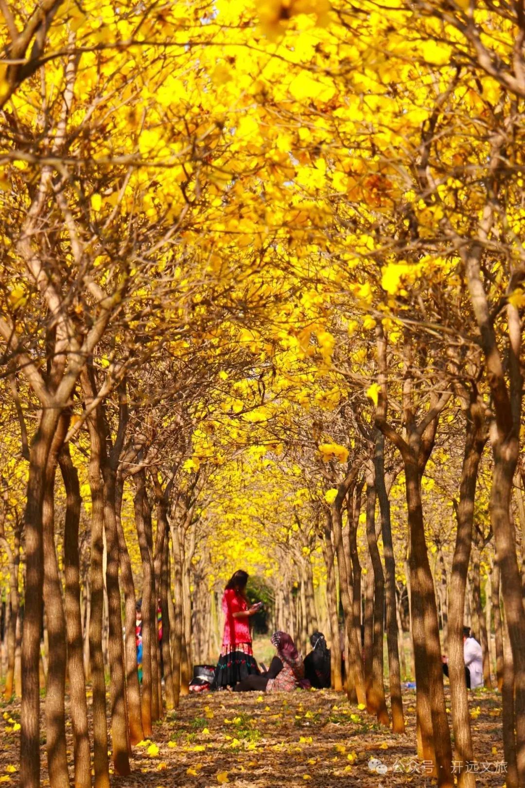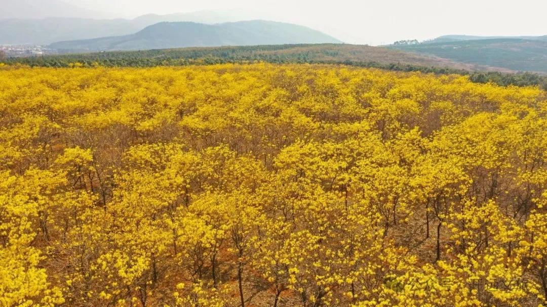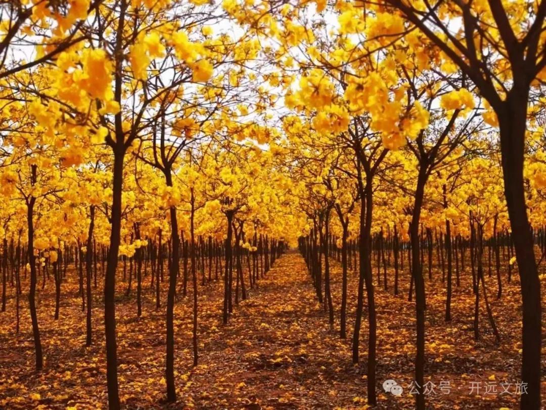 每年三月,当春风拂过,黑泥地的80亩黄花风铃木便惊艳绽放,如期上演“满城尽带黄金甲”的视觉盛宴 。一株株风铃木满树繁花,不见一片叶子,只见一串串金黄色的“风铃”挂满枝头,在蓝天白云的映衬下,明艳耀眼,摇曳多姿 。微风拂过,仿佛能听到春天的叮当声。
