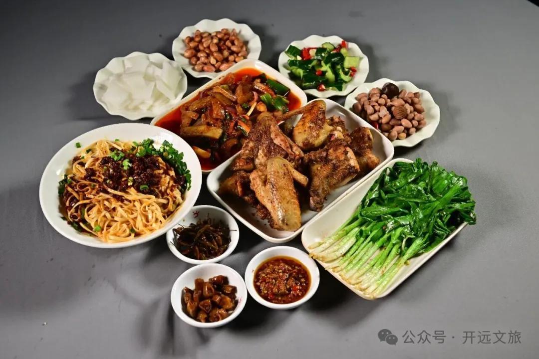 特色菜肴:烤鸭、牛肉干巴、各种炒菜