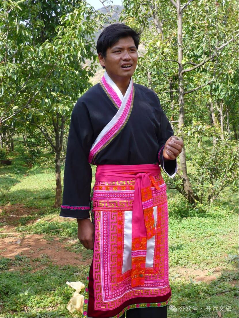 男装:碑格乡彝族(濮拉)男装以深蓝、黑色为基调。上衣右衽、前襟及袖口均有红色的手工绣品。左襟有一个大内袋,外出狩猎时装食物。外加穿前后襟开衩的麻布褂子(上半乡穿羊皮褂子)。裤为七分裤,为方便跋山涉水,裤脚大到可装一个人。腰带为红色手工编织,系一块红色手绣长围裙。