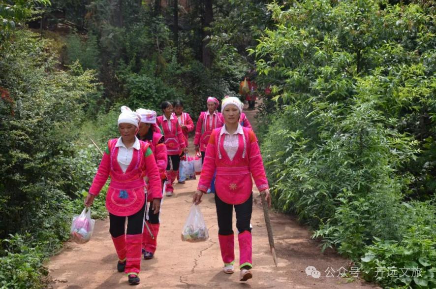 女装:上半乡以粉红色、水红色、白色为基调,下半乡以深红色、大红色为基调。上衣对襟、袖、前后襟均手工刺绣。前襟有两个大衣袋,方便采集、播种时装物。围腰为手工刺绣品,下半乡以方形为主;上半乡以圆形为主,外加穿不开衩的麻布褂子。