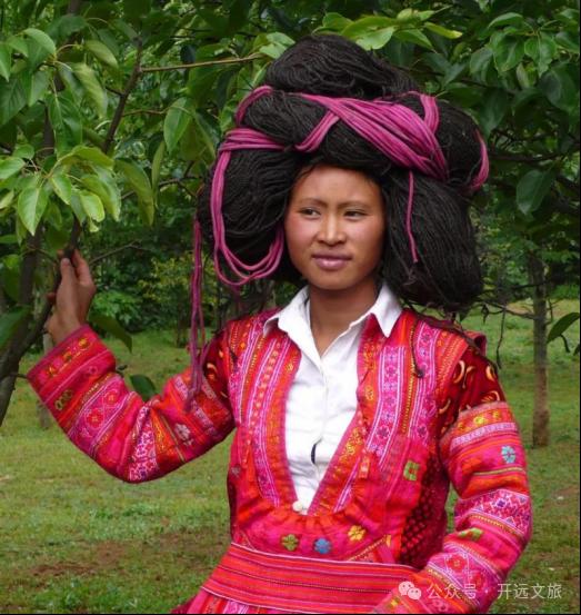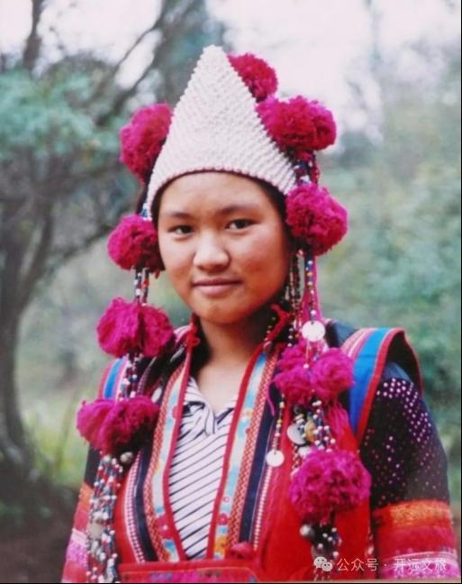 头饰:上半乡戴头巾或戴发辫编织的圆盘头饰;下半乡戴银泡制成的筒形帽,戴帽时用发压成正面三角形,帽顶两头尖的形状,再缀以红色毛线球串。