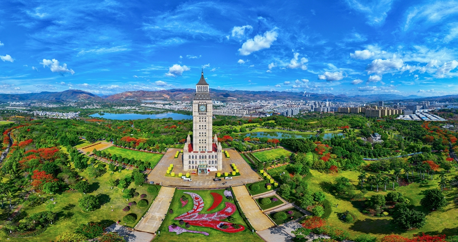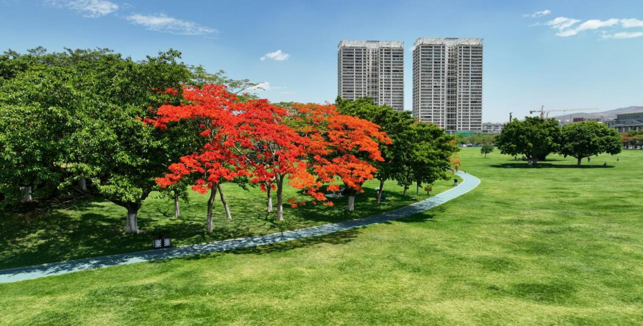 结合开远生态本底和气候特征,依托10个苗圃、1个鲜花基地,保证全市70%鲜花、80%树种供应,考虑植被季节性、独特性、协调性,使用樱花、风铃木、凤凰木等特色乡土树种和特色标识植物,打造“一街一果一飘香、一路一花一景色、一城多植半城绿”的特色城市景观。同时,坚持破墙透绿、见空插绿,利用造型各异的景观树因地造景,推广以藤本植物为重点的屋顶、墙面等立体绿化;以特色花箱打造绿美道口,丰富园林造景。2022年以来,新栽、补栽、换栽绿化苗木190余万株(袋),绿化面积3.74万平方米。如今的凤凰花开,已成为开远传递文明理念、优化营商环境、独具特色的城市品牌。