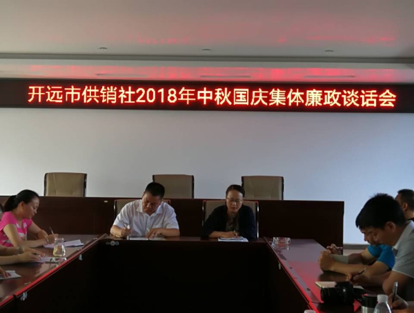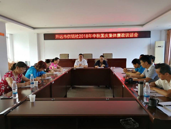 9月17日,开远市供销社在市纪委市监察委派驻市政府办公室纪检监察组的指导下,召开中秋国庆节前集体廉政谈话会,市供销社党组书记、主任丁顺福主持会议并进行集体廉政谈话。