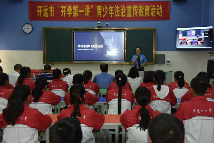 为深入贯彻落实开远市“七五”普法规划,进一步加大青少年法治宣传力度,增强青少年宪法意识和法律意识,促使青少年学生遵纪守法,健康成长。9月13日,开远市司法局、开远市教育局、开远铁路运输检察院联合在全市各中小学校开展“开学第一讲”青少年法治宣传教育活动。