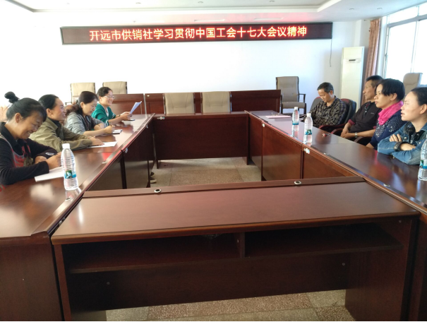 11月12日下午,开远市供销社在会议室召开专题会议,学习贯彻中国工会十七大会议精神,系统工会委员及行政领导参加了会议。