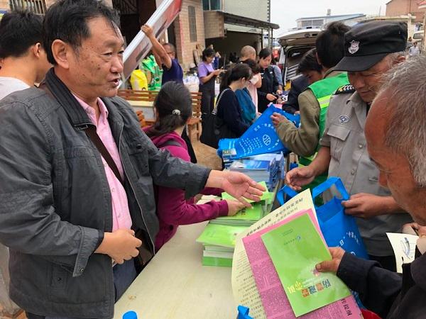 向群众发放宣传材料