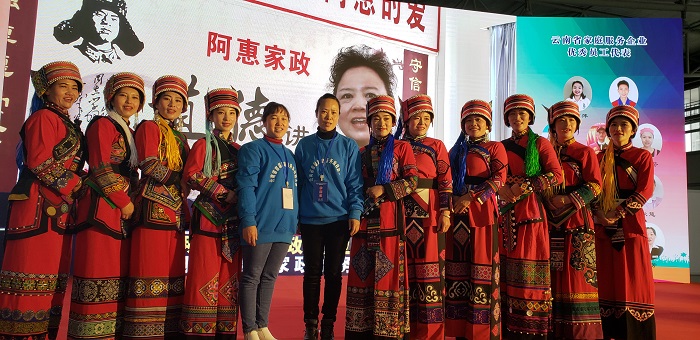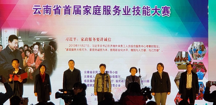 为更好地宣传贯彻家庭服务业促进就业的各项政策措施,提高家庭服务业从业人员职业素质和技能水平,开展好滇沪劳务协作,弘扬“尊重劳动、崇尚技能”的精神,让更多的群众了解、关心、参与、选择家庭服务业,云南省农民工工作领导小组于2018年12月11日在昆明会展中心举办为期二天的首届家庭服务业技能大赛暨技能展示活动。我市按照省、州农民工办要求,通过筛选审核,组织开远市朋阳敬老中心唐丽芬、李贵兰两位从事养老护理的一线在职人员参加角逐,唐丽芬获得优秀奖。