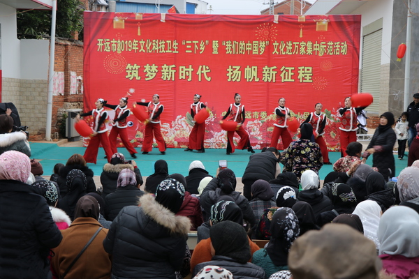 为深入贯彻党的十九大精神及开远市相关会议精神,围绕农业农村现代化的总目标,落实产业兴旺、生态宜居、乡风文明、治理有效、生活富裕的总要求,由中共开远市委市政府主办,市委宣传部、大庄乡政府承办的主题为“筑梦新时代扬帆新征程”2019年文化科技卫生“三下乡”暨“我们的中国梦”文化进万家活动在大庄乡新集镇拉开帷幕。