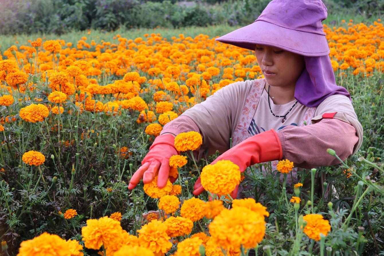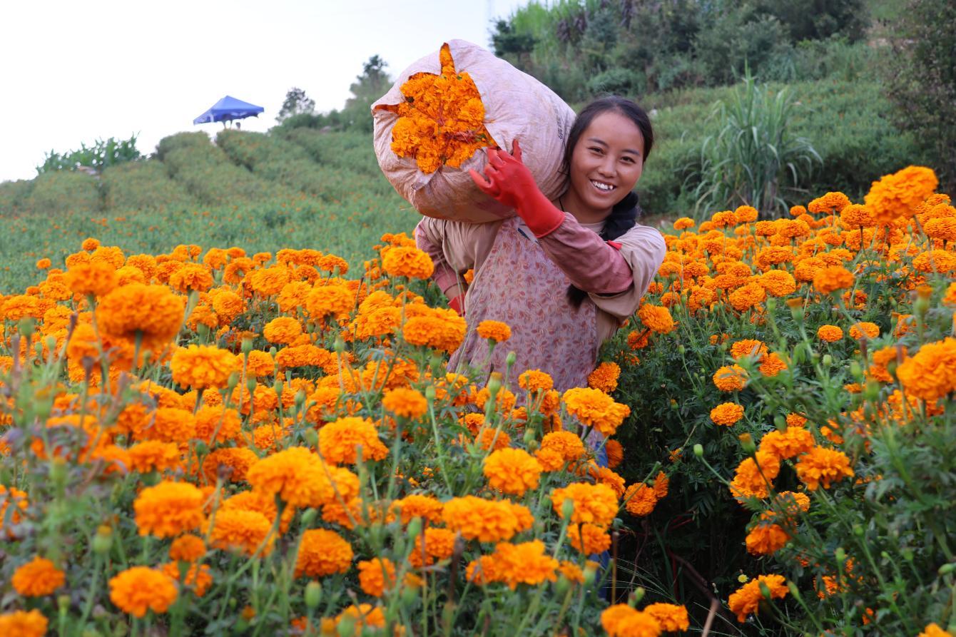 每年8-9月是万寿菊采收期,此时的万寿菊花瓣饱满、有效成分含量高。采摘季的到来,让石洞村格外热闹,田间随处可见忙碌的身影,无论是熟练的村民,还是假期回乡的年轻人,都欣然加入到这场充满希望的劳作中,大家用双手采摘丰收,为生活增添更多底气。