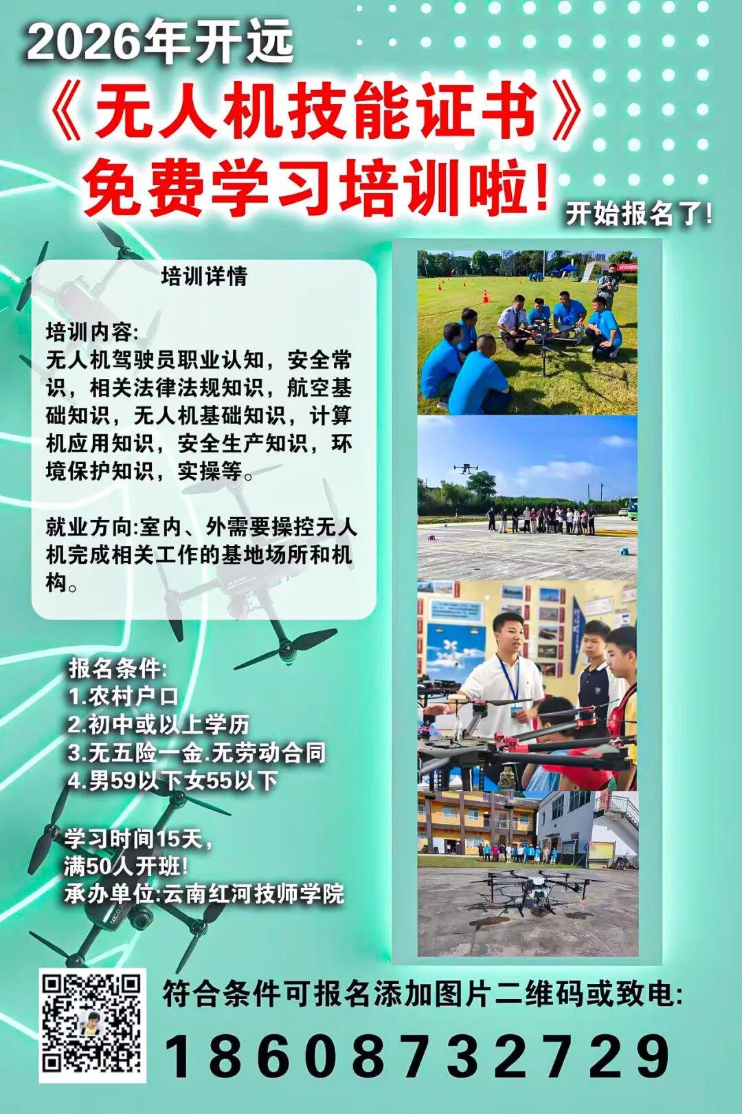 报名小贴士:想报名下一期无人机技能培训的乡亲,可以直接扫描图中二维码,或拨打联系电话咨询详细报名信息,别错过免费学技术、持证闯新路的好机会哟!
