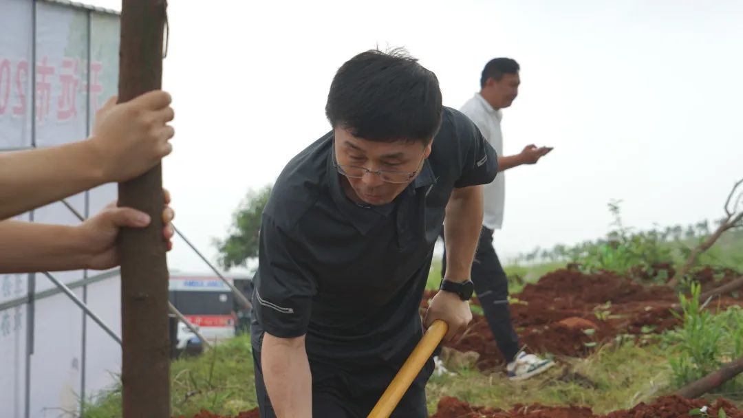 植树现场,大家热情洋溢、干劲十足,扶正苗木、铲土入坑、培土固土、提桶浇水......各个环节衔接有序、配合默契