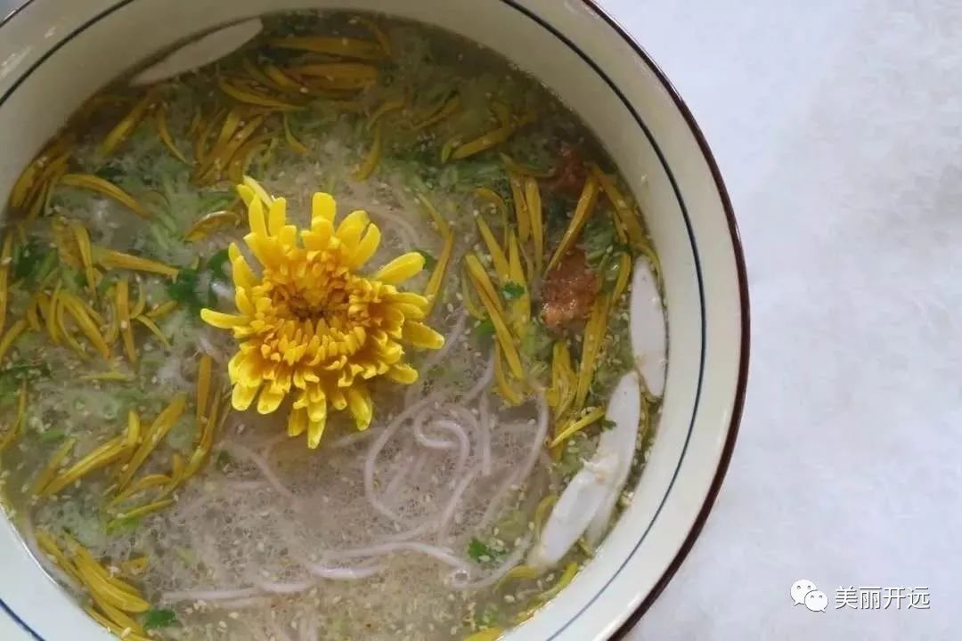 菊花米线已经成了开远的一个符号,也是身处异乡开远人的一份情结,无论你身在何方,提到米线便会勾起心底的乡愁,鹌鹑蛋、肉片、菊花、豌豆坨、鸡肉块等配料依次倒入香浓汤中,最后放米线,稍作搅拌,香气四溢~